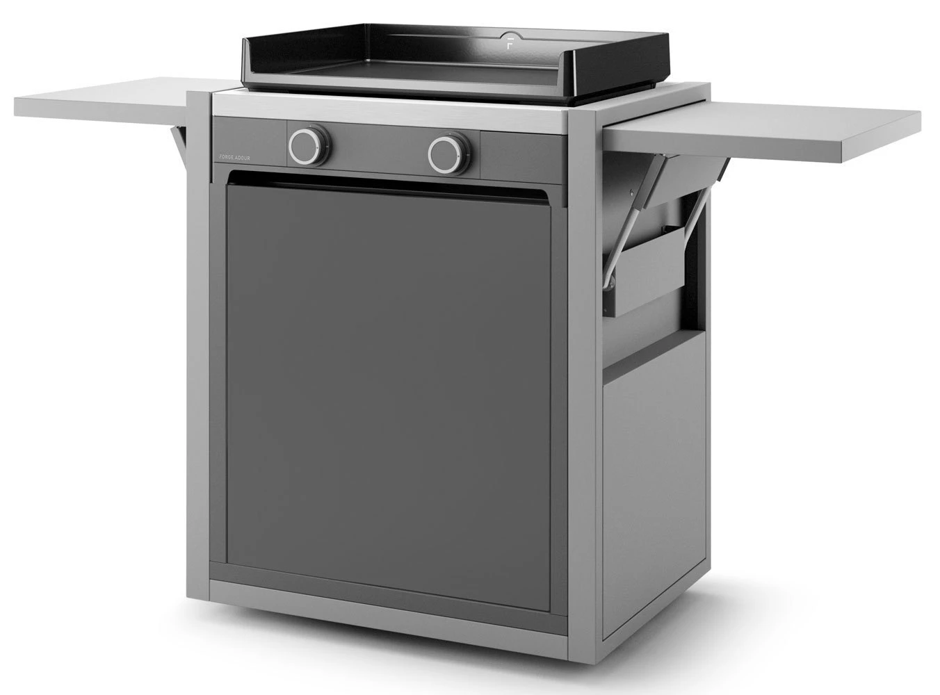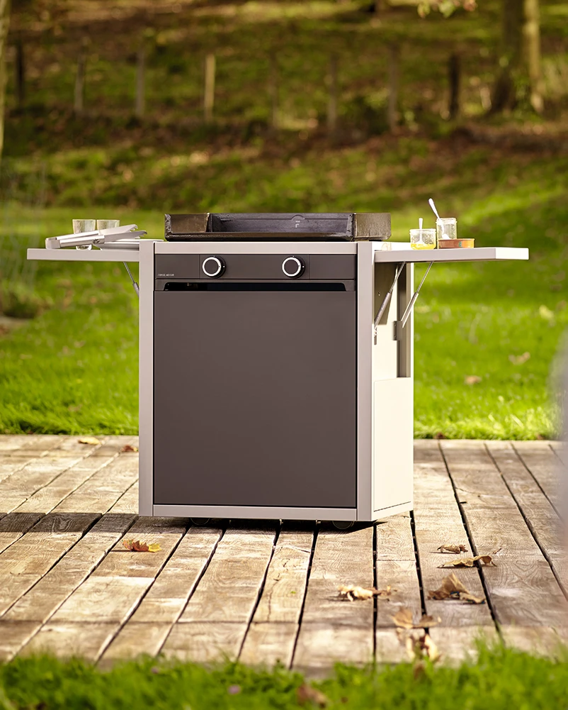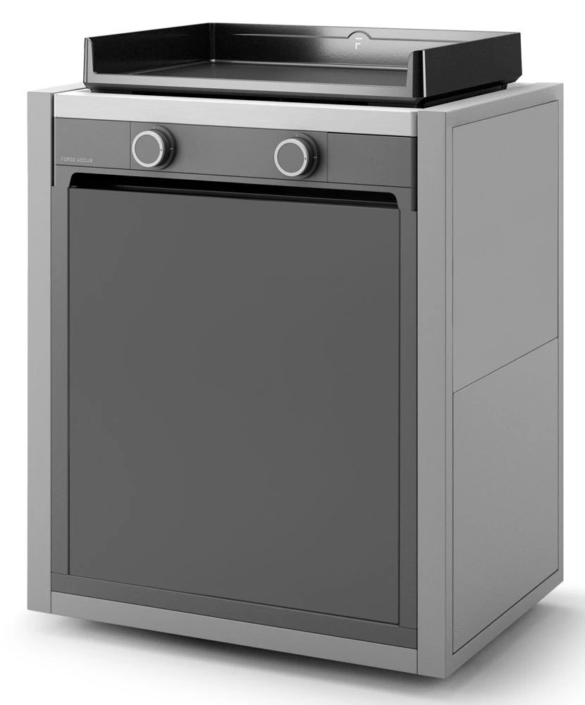 Este carro es el complemento perfecto para trabajar más cómodamente en nuestra plancha. Se adaptan perfectamente las planchas Modern 60 y otras de igual medida. De diseño cerrado, está construido en Acero Esmaltado, incluye puerta frontal con almacenamiento para para la botella de gas y apertura «Push to open» y dos mesas de trabajo laterales abatibles con muelle hidráulico.