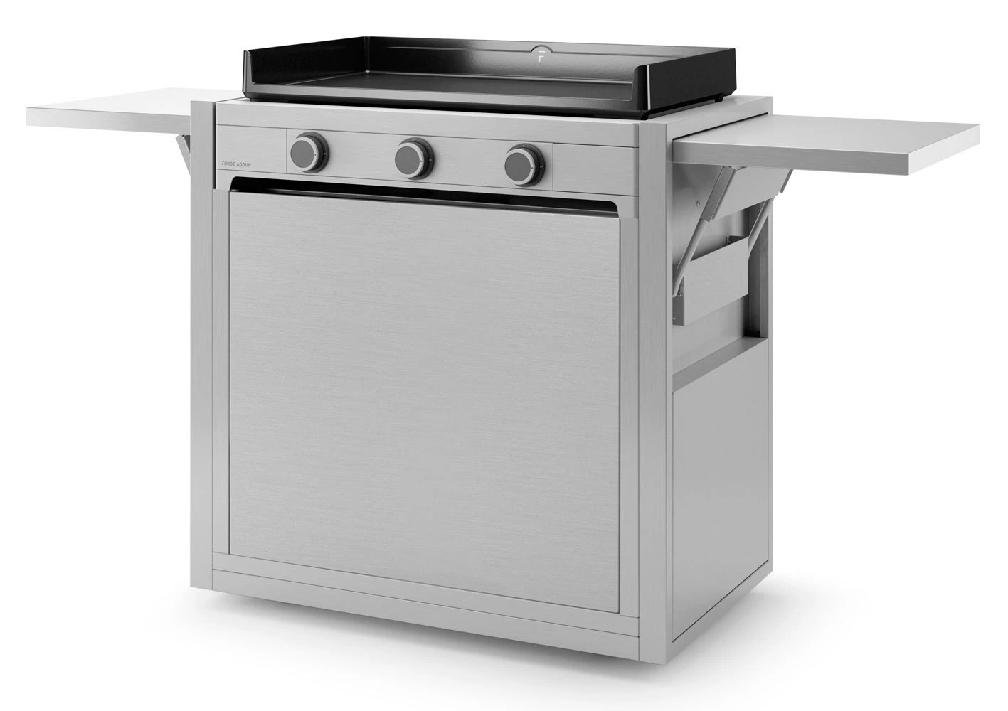 Este carro es el complemento perfecto para trabajar más cómodamente en nuestra plancha. Se adaptan perfectamente las planchas Modern 75 y otras de igual medida. De diseño cerrado, está construido en Acero Inoxidable, incluye puerta frontal con almacenamiento para para la botella de gas y apertura «Push to open» y dos mesas de trabajo laterales abatibles con muelle hidráulico.